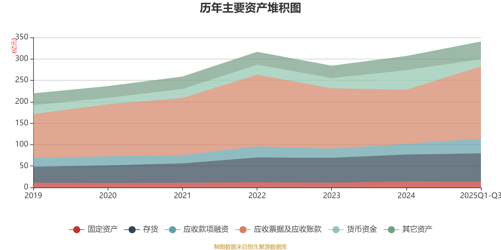 资产重大变化方面,截至2025年三季度末,公司货币资金较上年末减少62.92%,占公司总资产比重下降9.9个百分点;应收票据及应收账款较上年末增加33.8%,占公司总资产比重上升8.43个百分点;应收款项融资较上年末增加37.14%,占公司总资产比重上升1.93个百分点;存货较上年末增加5.13%,占公司总资产比重下降1.08个百分点。