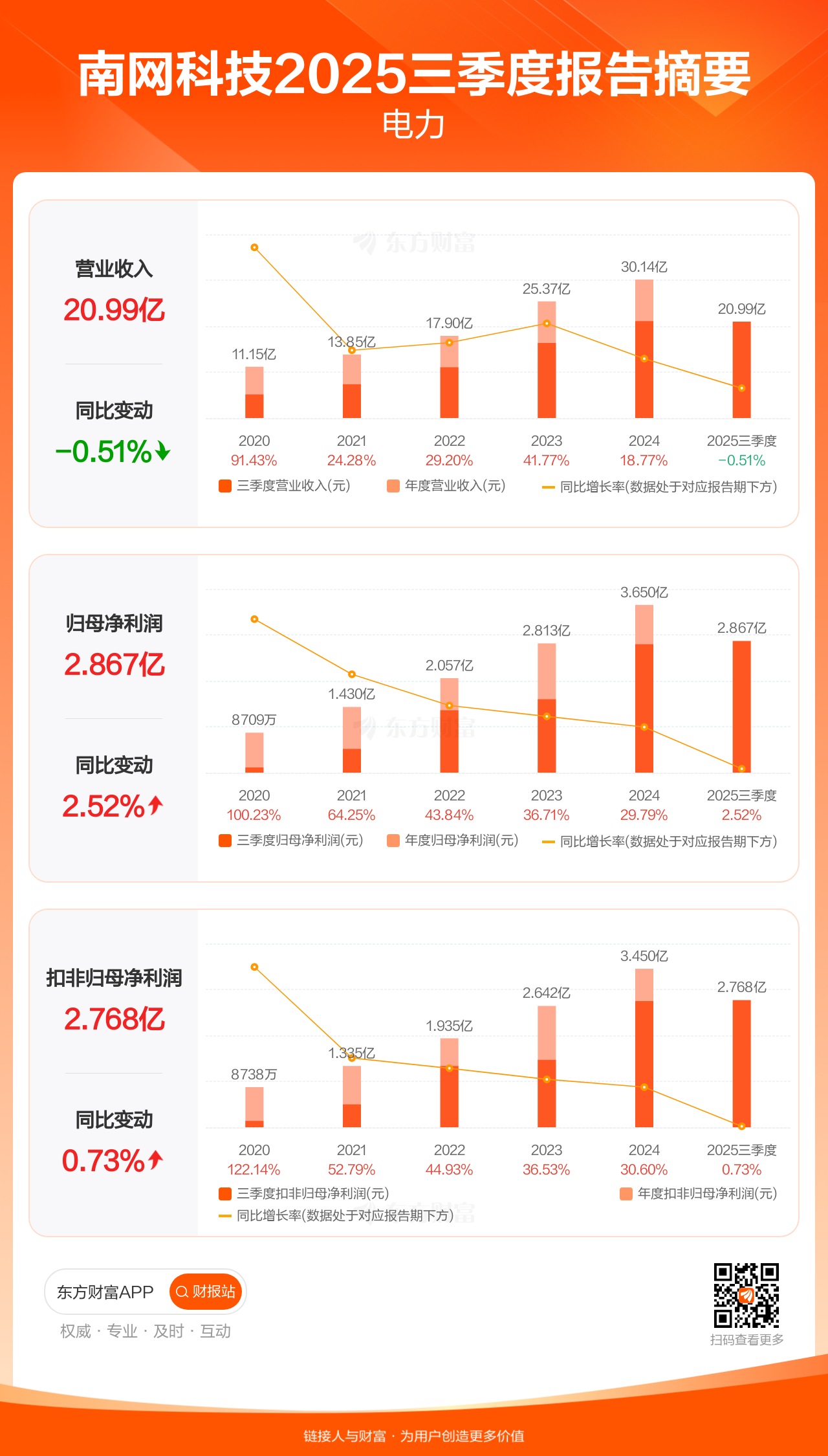南网科技10月31日发布2025年三季报显示,公司前三季实现营业收入20.99亿元,同比下滑0.51%;归母净利润2.87亿元,同比增长2.52%;扣非归母净利润2.77亿元,同比增长0.73%。