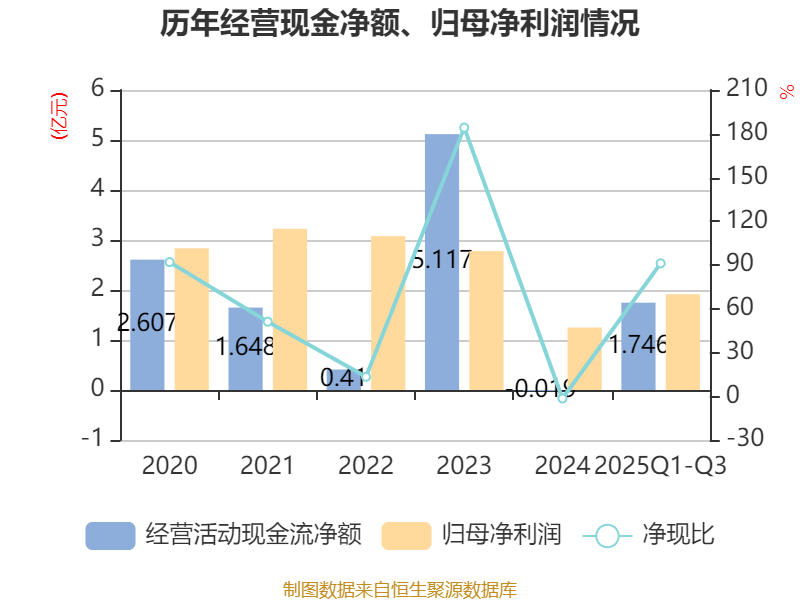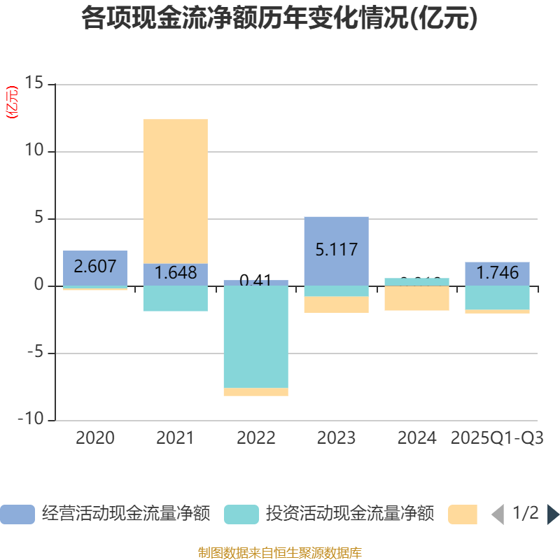 2025年前三季度,公司经营活动现金流净额为1.75亿元,同比增加1.92亿元;筹资活动现金流净额-2738.4万元,同比增加1.17亿元;投资活动现金流净额-1.8亿元,上年同期为5082.81万元。