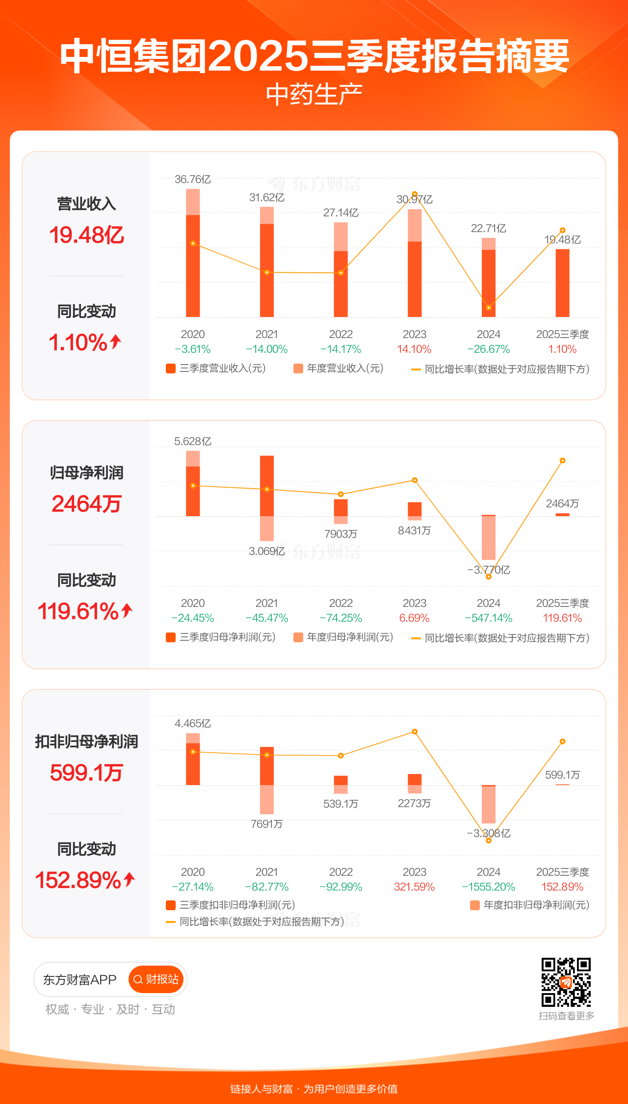 中恒集团10月31日发布2025年三季报显示,公司前三季实现营业收入19.48亿元,同比增长1.10%;归母净利润2464.04万元,同比增长119.61%;扣非归母净利润599.11万元,同比增长152.89%。