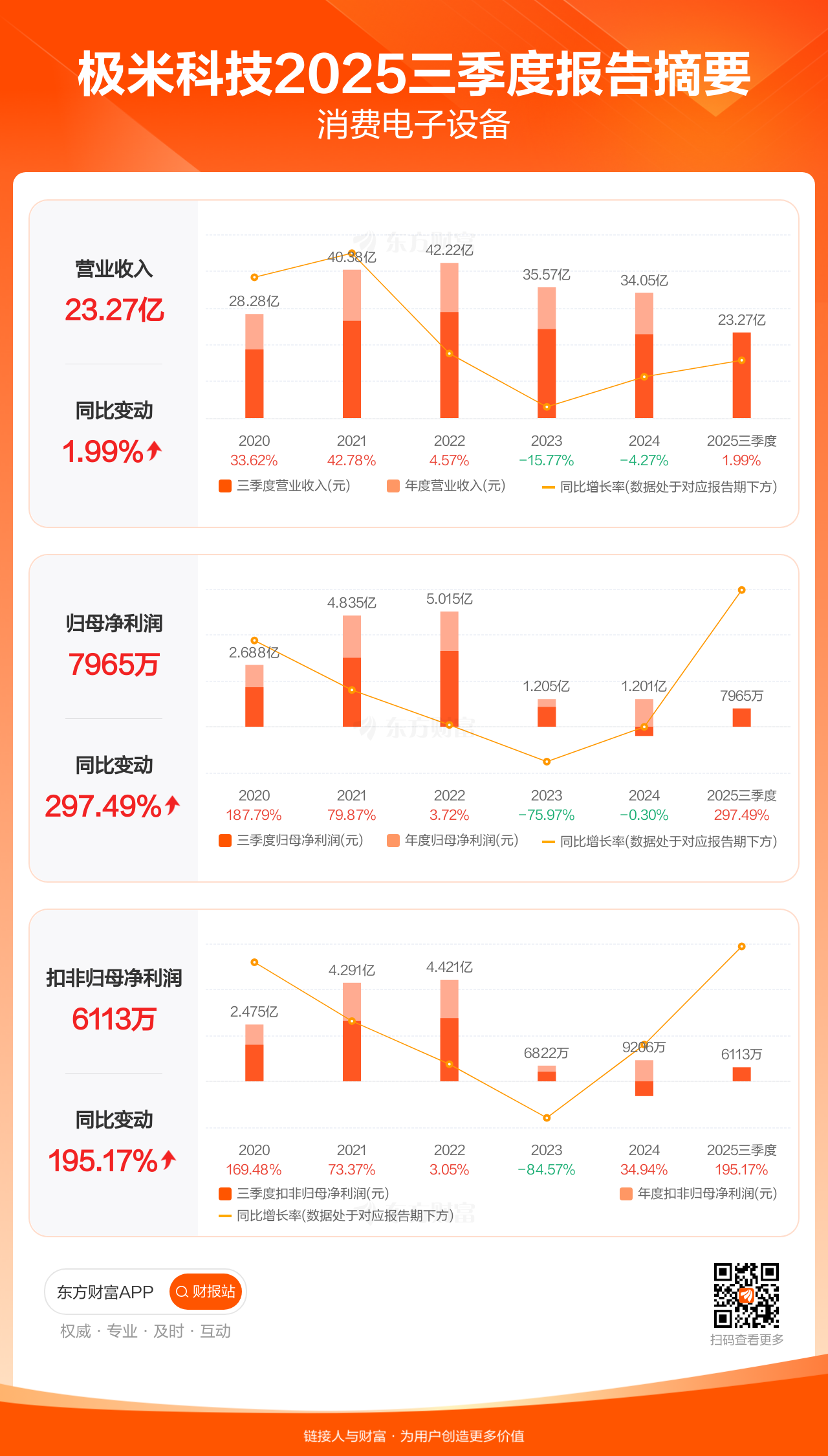 极米科技10月31日发布2025年三季报显示,公司前三季实现营业收入23.27亿元,同比增长1.99%;归母净利润7965.01万元,同比增长297.49%;扣非归母净利润6112.95万元,同比增长195.17%。