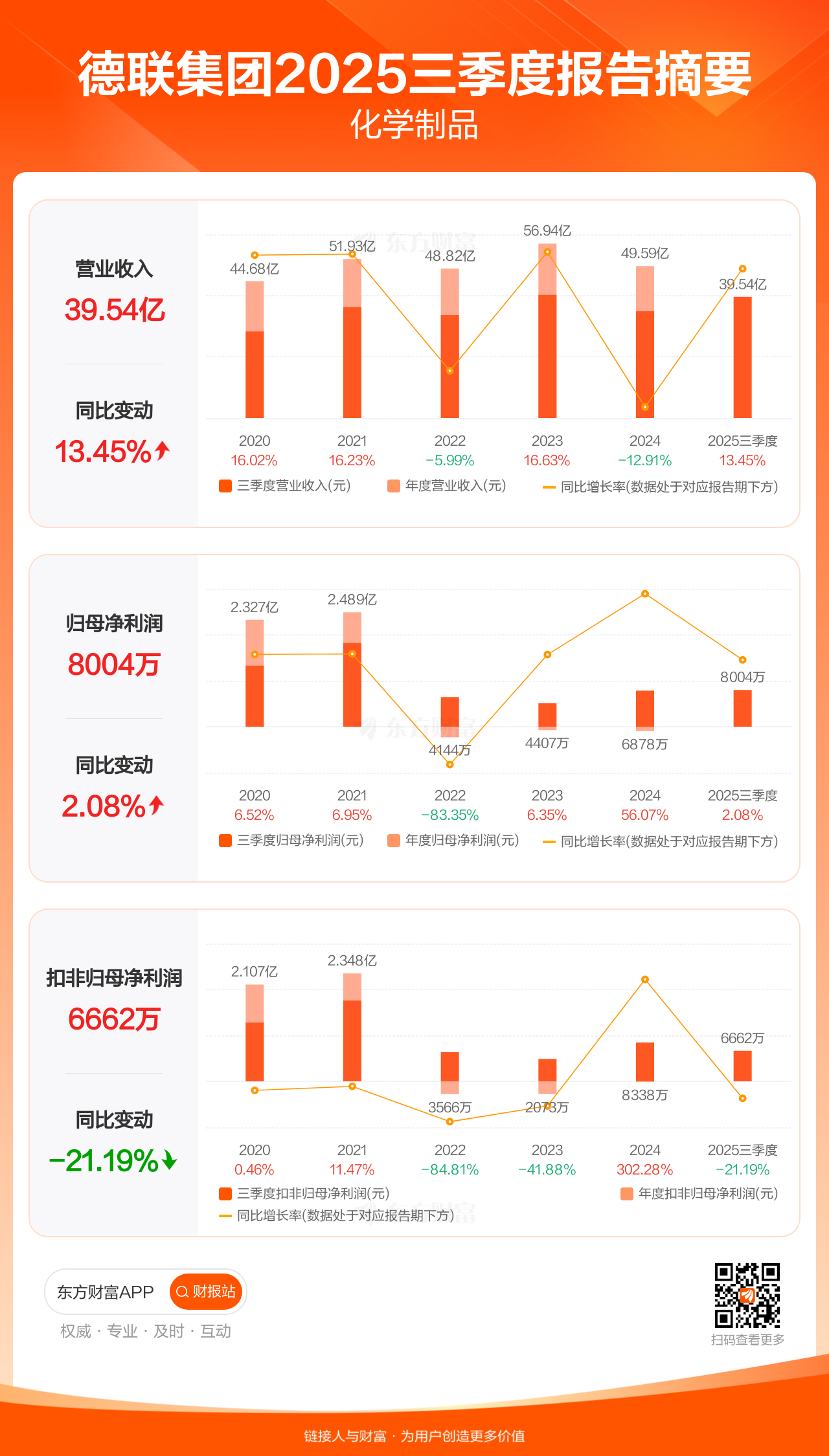 德联集团10月31日发布2025年三季报显示,公司前三季实现营业收入39.54亿元,同比增长13.45%;归母净利润8004.33万元,同比增长2.08%;扣非归母净利润6662.12万元,同比下滑21.19%。