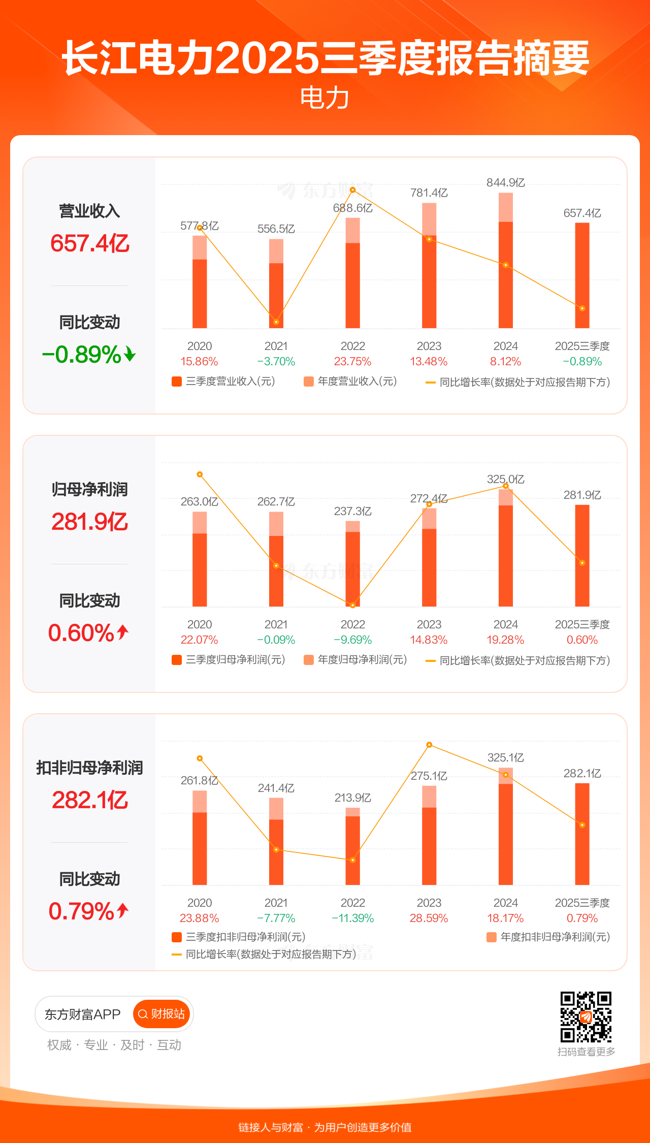 长江电力10月31日发布2025年三季报显示,公司前三季实现营业收入657.41亿元,同比下滑0.89%;归母净利润281.93亿元,同比增长0.60%;扣非归母净利润282.07亿元,同比增长0.79%。