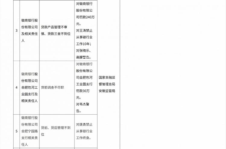 徽商银行股份有限公司因贷款产品管理不审慎、贷款三查不到位,被国家金融监督管理总局罚款240万元;相关责任人王涛被禁止从事银行业工作10年,张晓乐、高朦被警告。