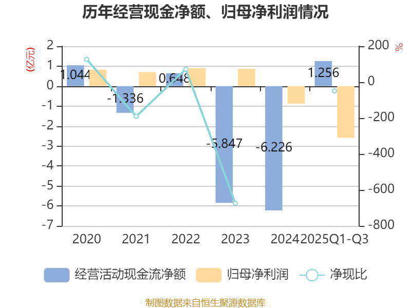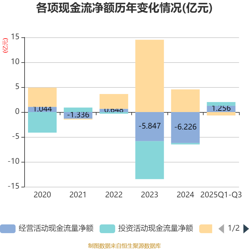 2025年前三季度,公司经营活动现金流净额为1.26亿元,同比增加9.21亿元;筹资活动现金流净额-6878.03万元,同比减少5.54亿元;投资活动现金流净额7522.01万元,上年同期为-233.93万元。