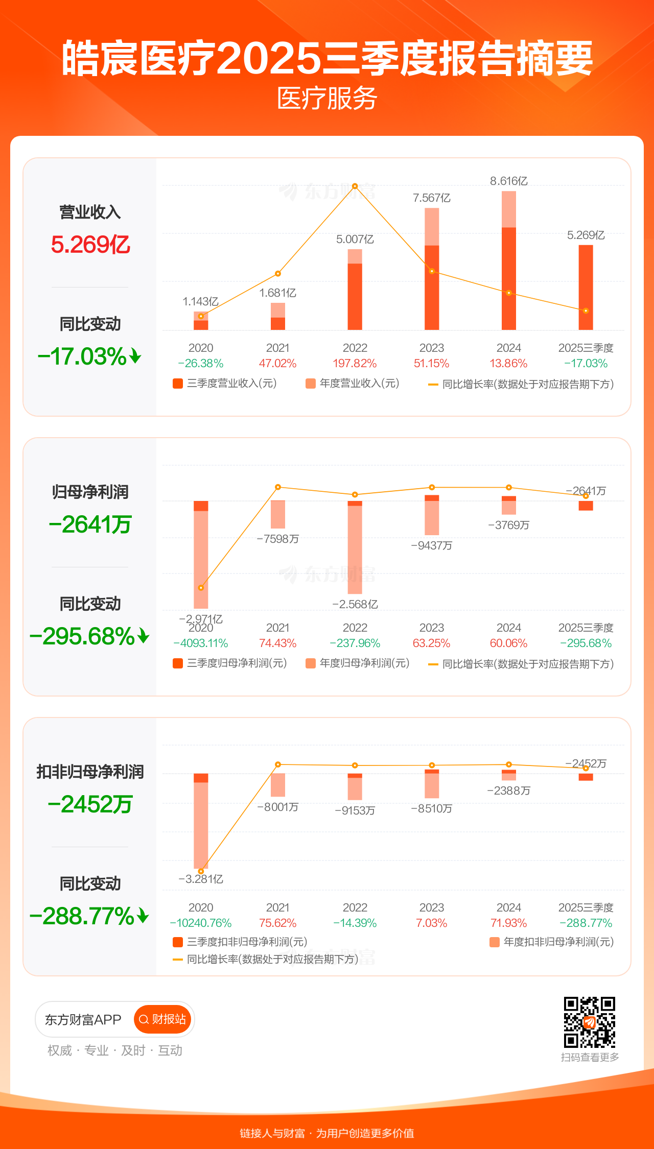 皓宸医疗10月31日发布2025年三季报显示,公司前三季实现营业收入5.27亿元,同比下滑17.03%;归母净利润-2640.98万元;扣非归母净利润-2452.45万元。
