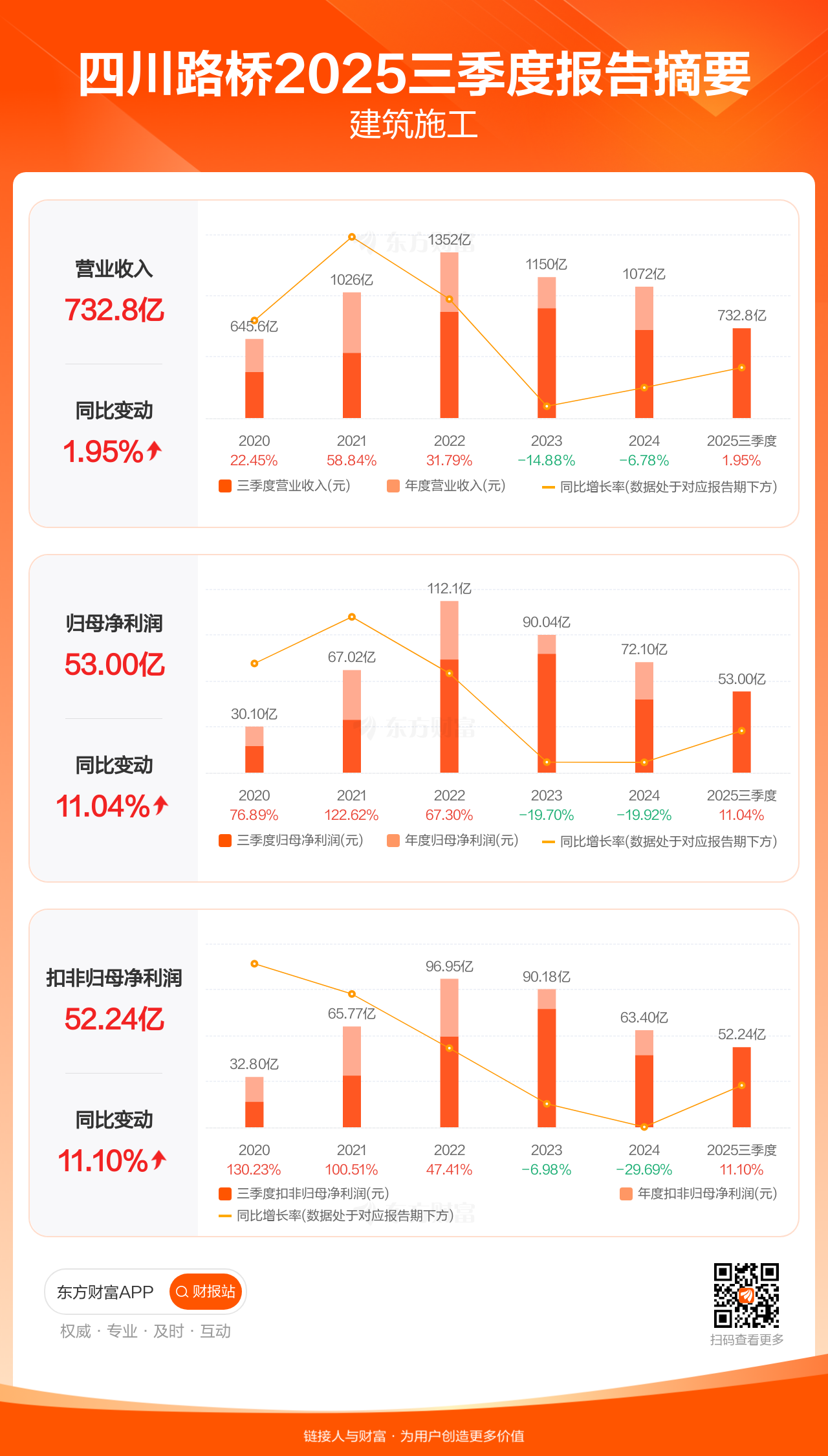 四川路桥10月31日发布2025年三季报显示,公司前三季实现营业收入732.81亿元,同比增长1.95%;归母净利润53.00亿元,同比增长11.04%;扣非归母净利润52.24亿元,同比增长11.10%。