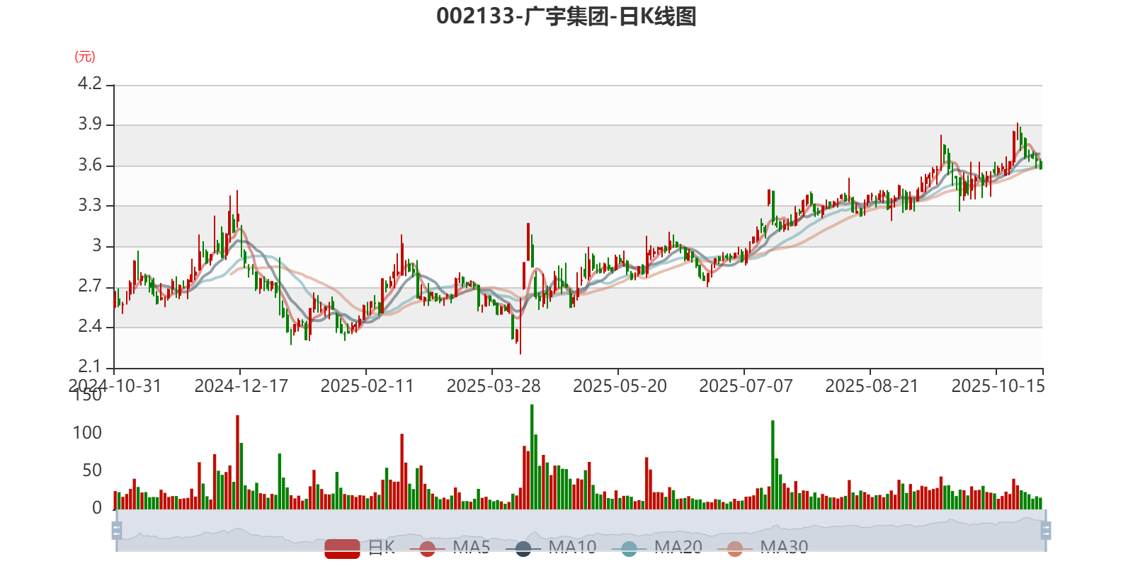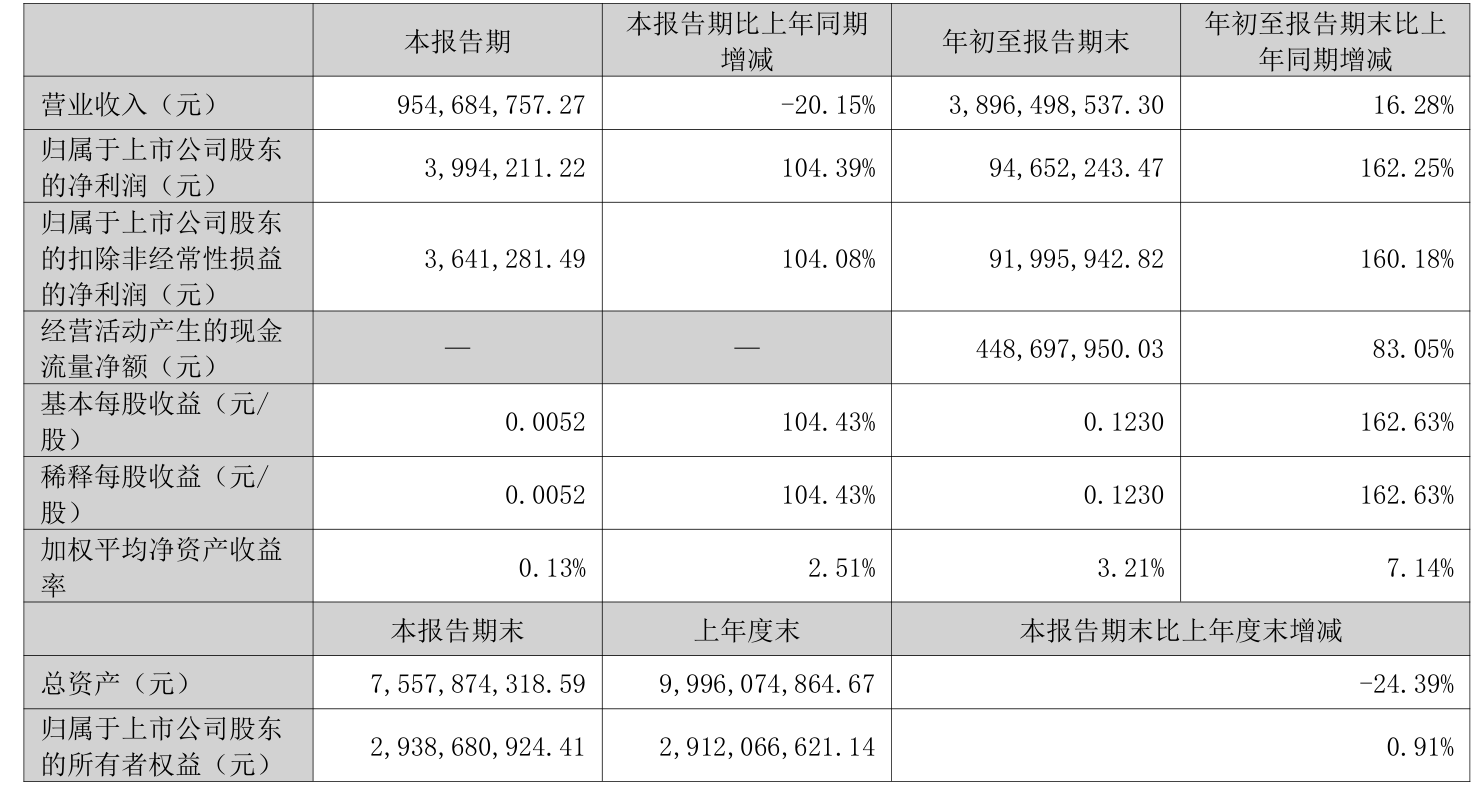 中证智能财讯广宇集团(002133)10月31日披露2025年第三季度报告。前三季度公司实现营业总收入39亿元,同比增长16.26%;归母净利润9465.22万元,同比扭亏;扣非净利润9199.59万元,同比扭亏;经营活动产生的现金流量净额为4.49亿元,同比增长83.05%;报告期内,广宇集团基本每股收益为0.123元,加权平均净资产收益率为3.21%。