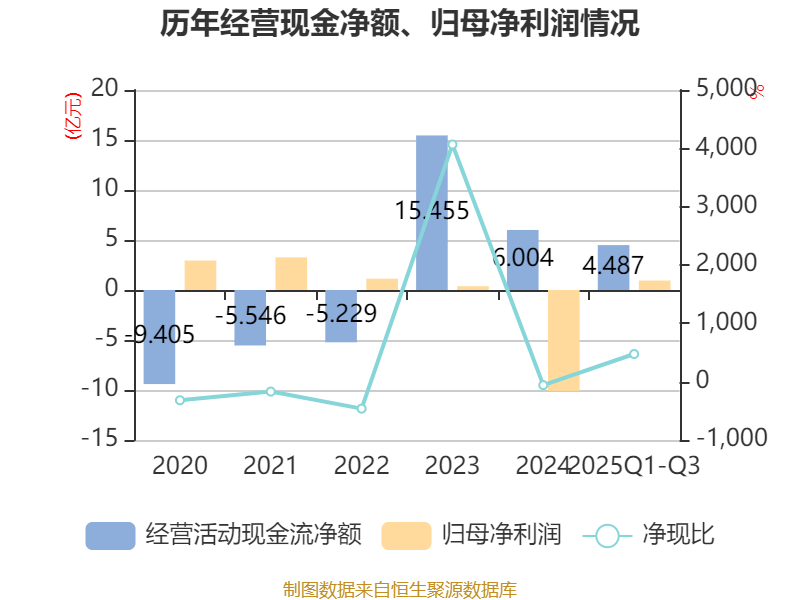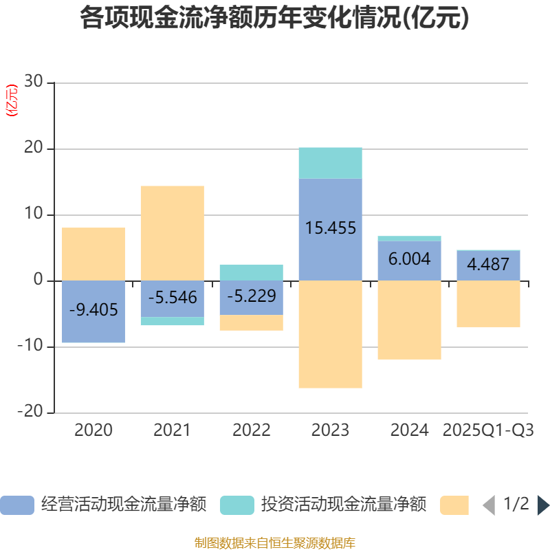 2025年前三季度,公司经营活动现金流净额为4.49亿元,同比增长83.05%;筹资活动现金流净额-7.08亿元,同比增加1.13亿元;投资活动现金流净额1305.68万元,上年同期为1.27亿元。