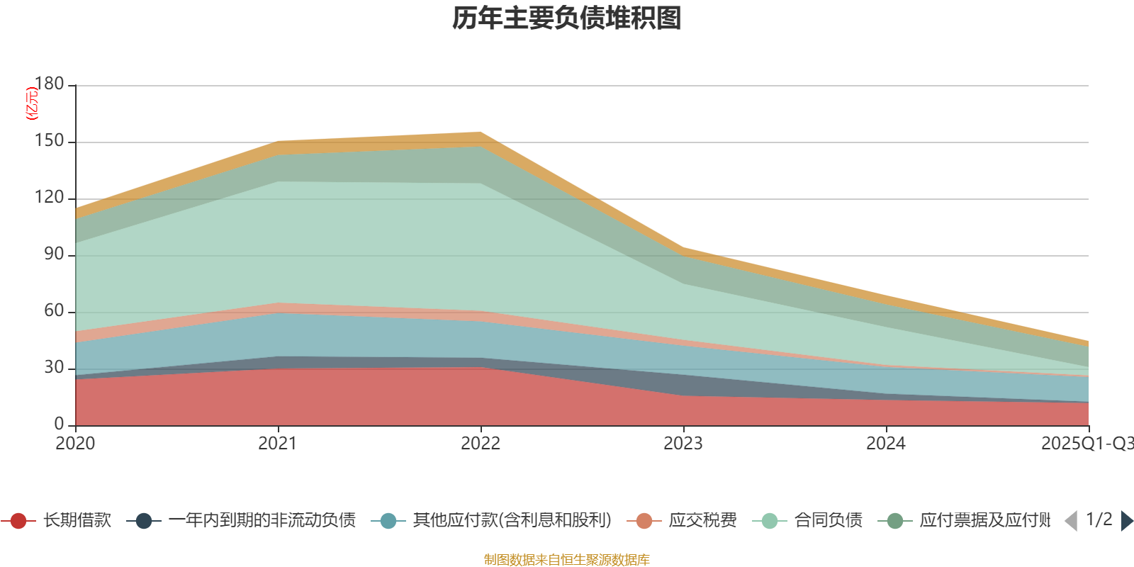 负债重大变化方面,截至2025年三季度末,公司合同负债较上年末减少78.2%,占公司总资产比重下降14.26个百分点;其他应付款(含利息和股利)较上年末减少8.02%,占公司总资产比重上升3.07个百分点;一年内到期的非流动负债较上年末减少78.77%,占公司总资产比重下降2.45个百分点;应付票据及应付账款较上年末减少10.1%,占公司总资产比重上升2.27个百分点。