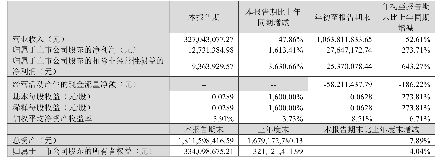 中证智能财讯依米康(300249)10月31日披露2025年第三季度报告。前三季度公司实现营业总收入10.64亿元,同比增长52.61%;归母净利润2764.72万元,同比增长273.71%;扣非净利润2537.01万元,同比增长643.27%;经营活动产生的现金流量净额为-5821.14万元,上年同期为6751.75万元;报告期内,依米康基本每股收益为0.0628元,加权平均净资产收益率为8.51%。