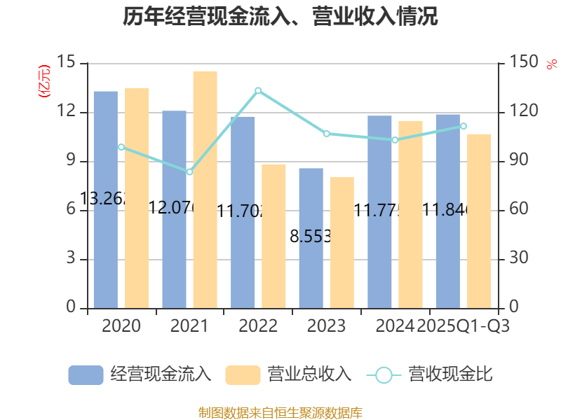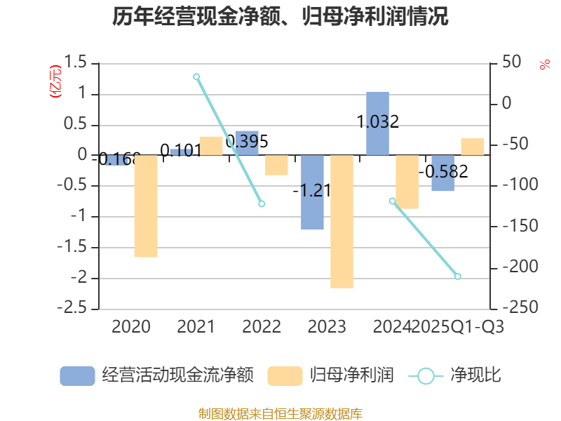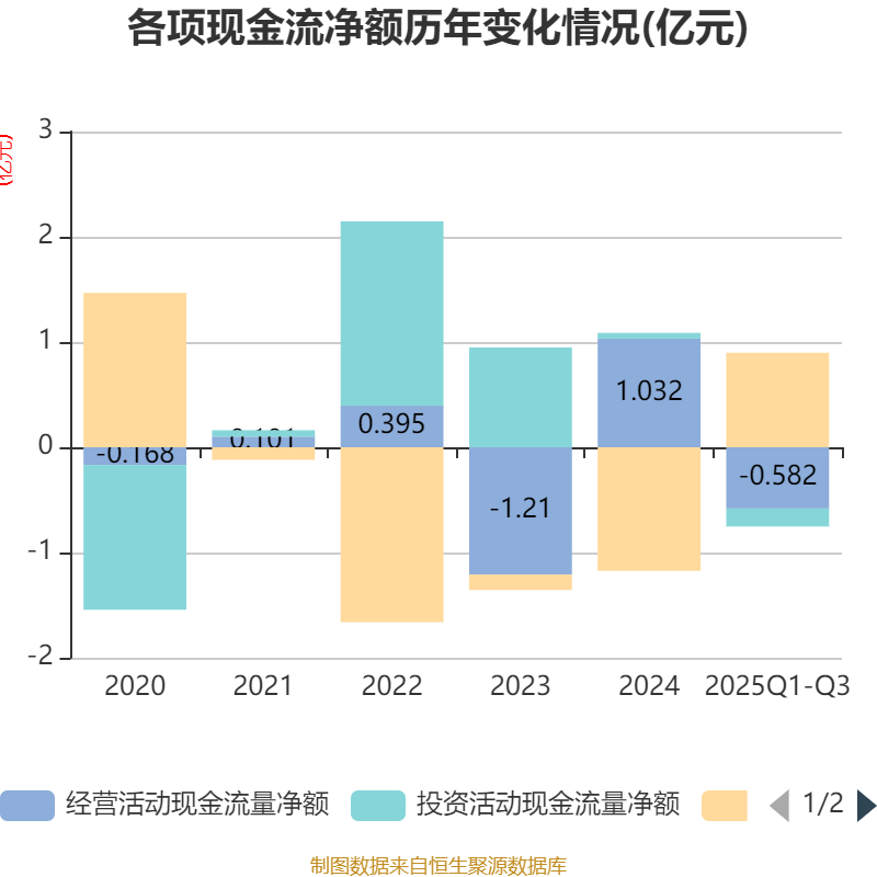 2025年前三季度,公司经营活动现金流净额为-5821.14万元,同比减少1.26亿元;筹资活动现金流净额8984.75万元,同比增加1.93亿元;投资活动现金流净额-1708.38万元,上年同期为1101.01万元。
