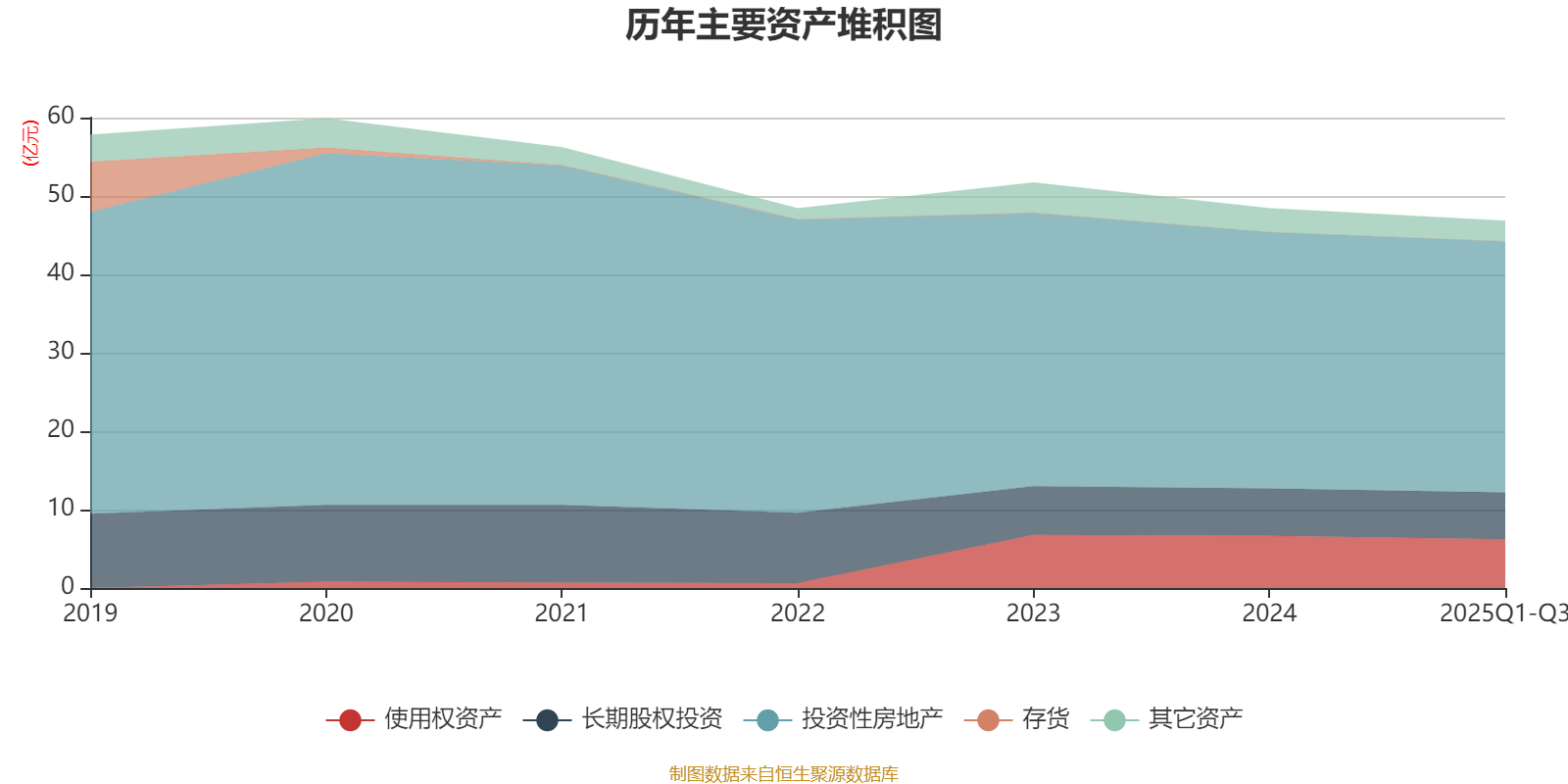 资产重大变化方面,截至2025年三季度末,公司投资性房地产较上年末减少2.03%,占公司总资产比重上升0.88个百分点;使用权资产较上年末减少6.37%,占公司总资产比重下降0.44个百分点;货币资金较上年末减少23.71%,占公司总资产比重下降0.34个百分点;其他应收款(含利息和股利)较上年末减少33.08%,占公司总资产比重下降0.26个百分点。