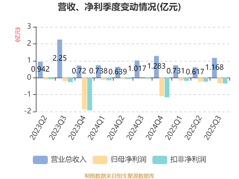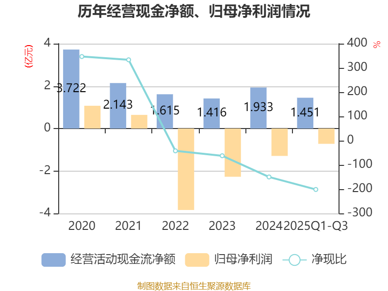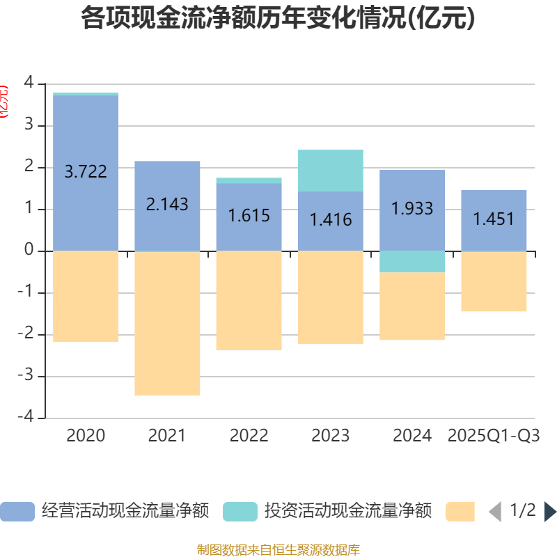 2025年前三季度,公司经营活动现金流净额为1.45亿元,同比增长77.87%;筹资活动现金流净额-1.42亿元,同比减少7001.87万元;投资活动现金流净额-362.76万元,上年同期为-944.35万元。