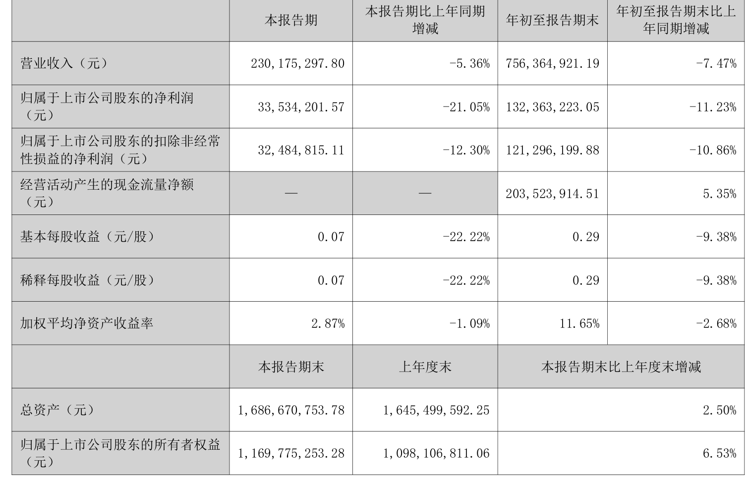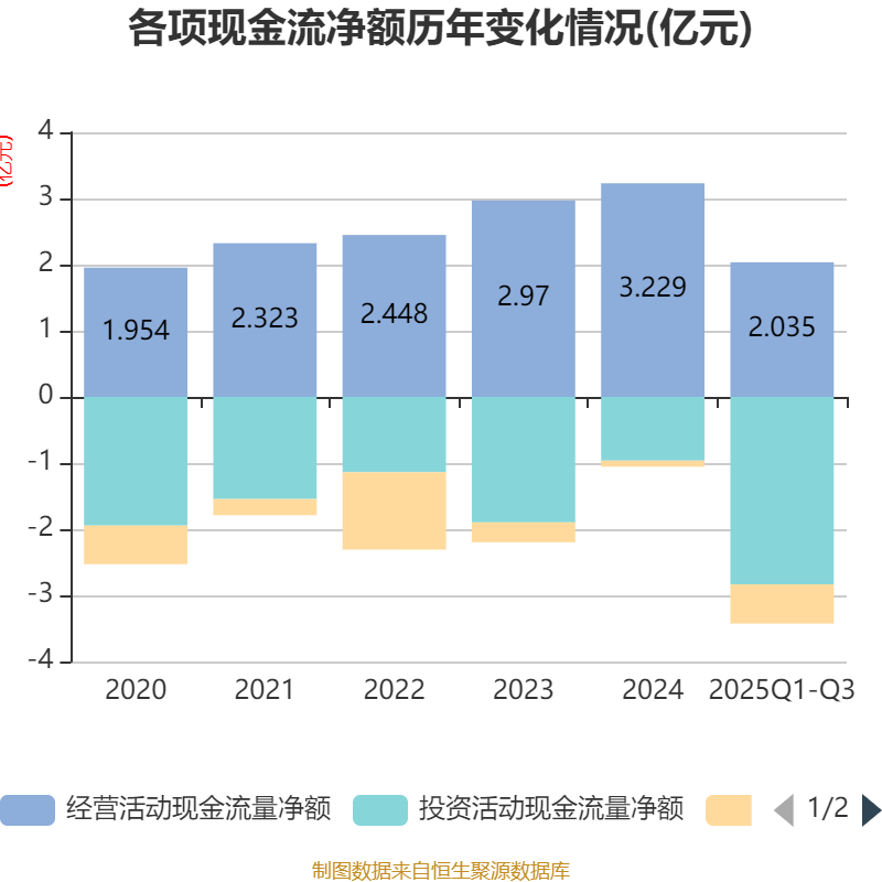 2025年前三季度,公司经营活动现金流净额为2.04亿元,同比增长5.35%;筹资活动现金流净额-5917.79万元,同比减少1.41亿元;投资活动现金流净额-2.83亿元,上年同期为-1.79亿元。