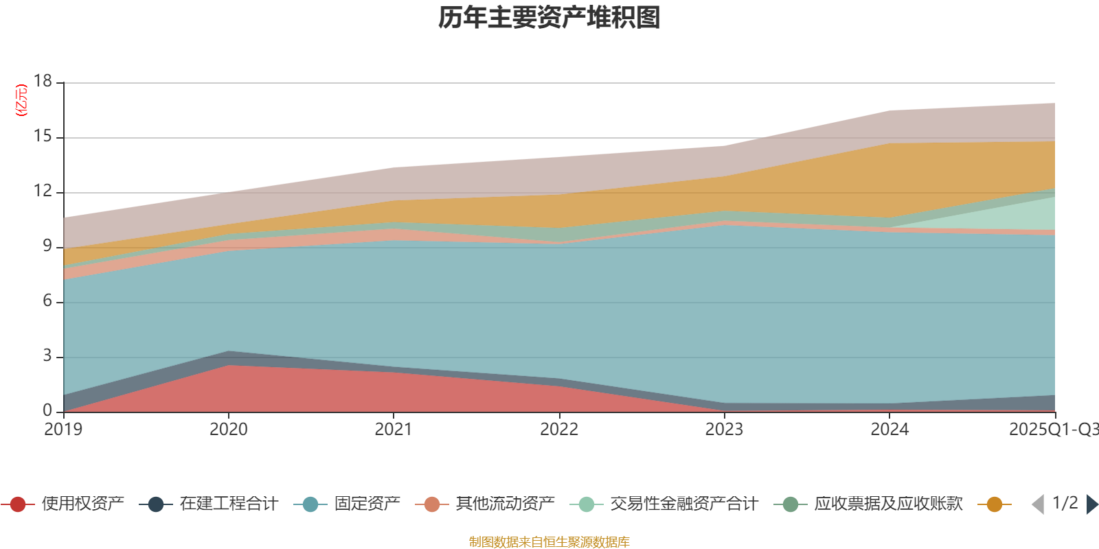 资产重大变化方面,截至2025年三季度末,公司交易性金融资产合计占公司总资产的10.68%,上年末为0;货币资金较上年末减少37.14%,占公司总资产比重下降9.57个百分点;固定资产较上年末减少6.53%,占公司总资产比重下降5.01个百分点;在建工程合计较上年末增加139.89%,占公司总资产比重上升2.82个百分点。