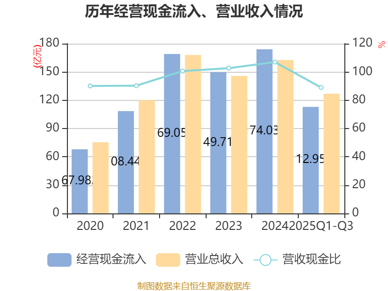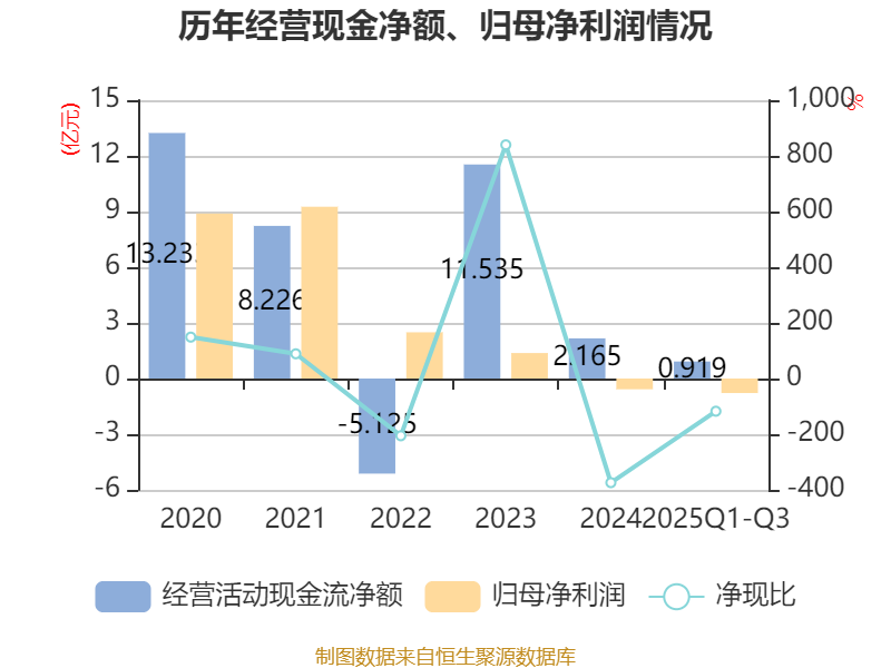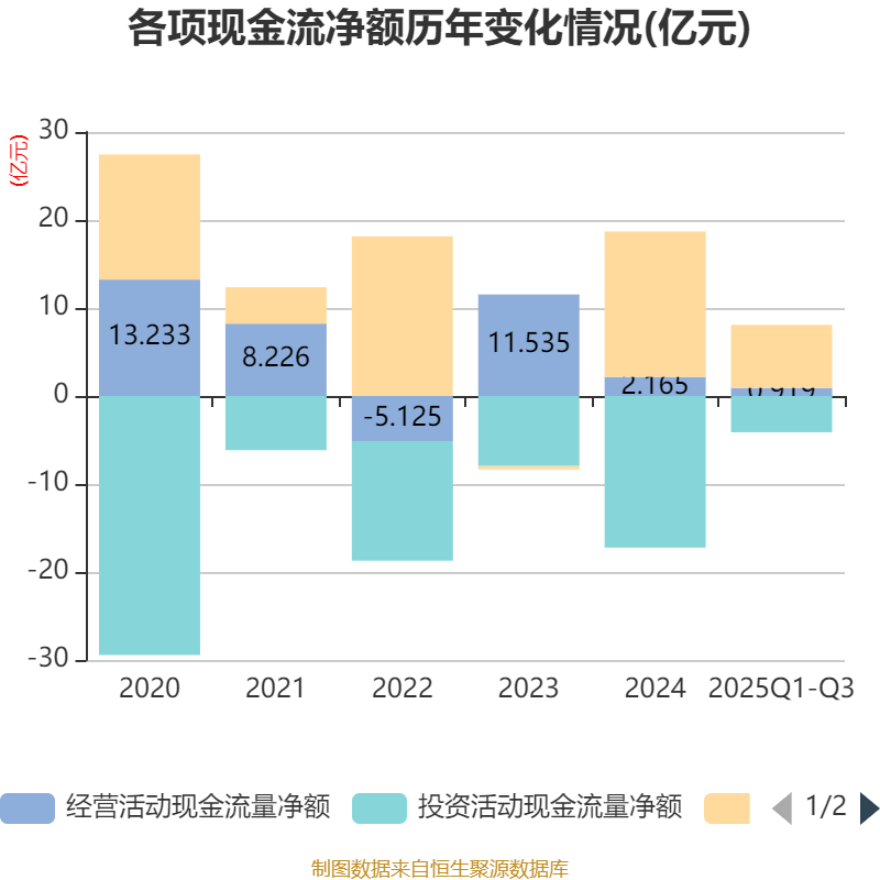 2025年前三季度,公司经营活动现金流净额为9185.45万元,同比下降87.21%;筹资活动现金流净额7.17亿元,同比增加5701.59万元;投资活动现金流净额-4.12亿元,上年同期为-8.67亿元。