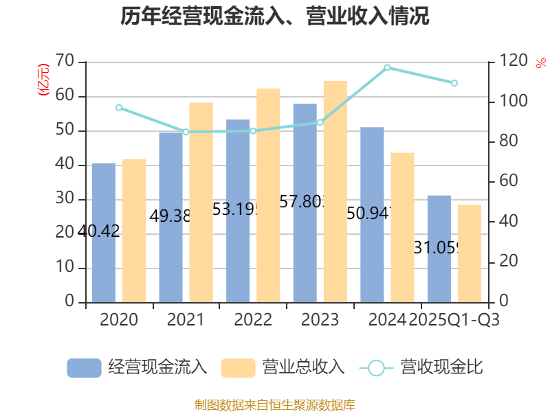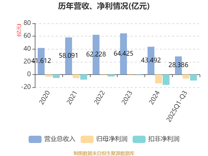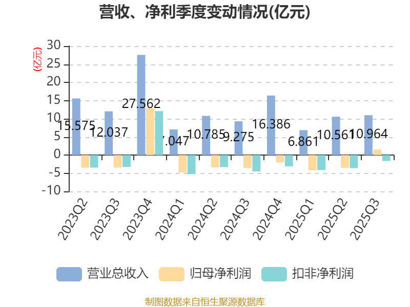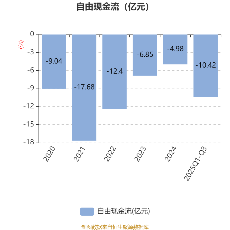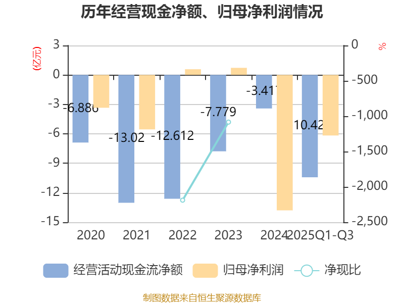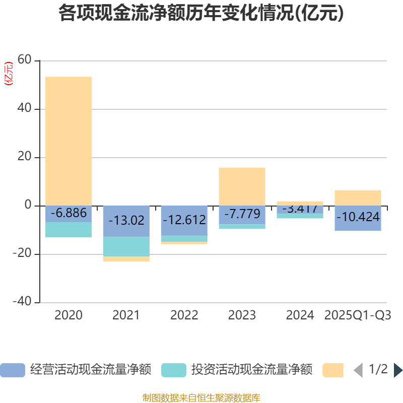 2025年前三季度,公司经营活动现金流净额为-10.42亿元,同比增加3.28亿元;筹资活动现金流净额6.3亿元,同比增加3.26亿元;投资活动现金流净额-756.68万元,上年同期为-1.77亿元。
