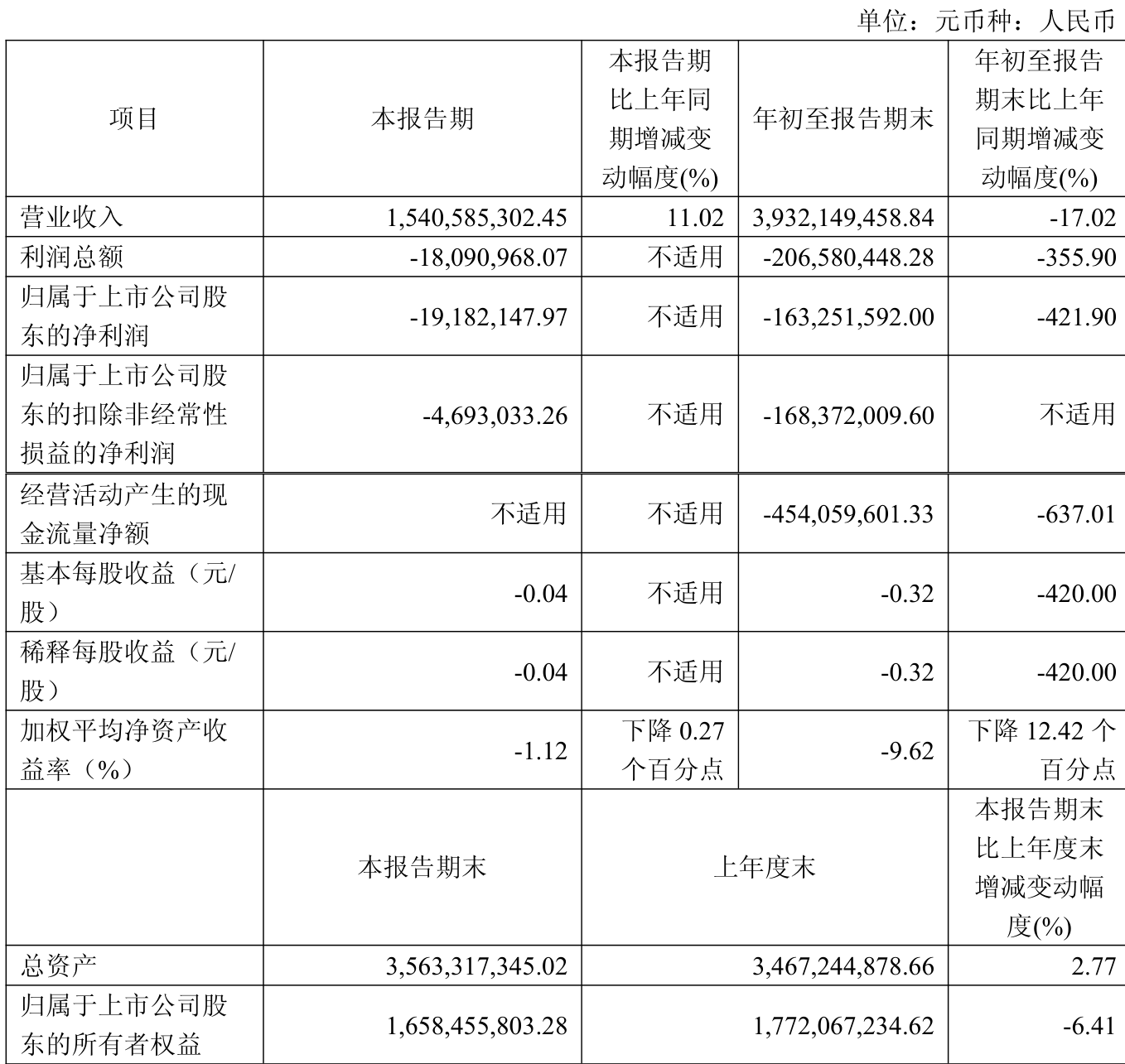 中证智能财讯永杉锂业(603399)10月31日披露2025年第三季度报告。前三季度公司实现营业总收入39.32亿元,同比下降17.02%;归母净利润亏损1.63亿元,上年同期盈利5071.55万元;扣非净利润亏损1.68亿元,上年同期亏损3236.79万元;经营活动产生的现金流量净额为-4.54亿元,上年同期为8455.31万元;报告期内,永杉锂业基本每股收益为-0.32元,加权平均净资产收益率为-9.62%。