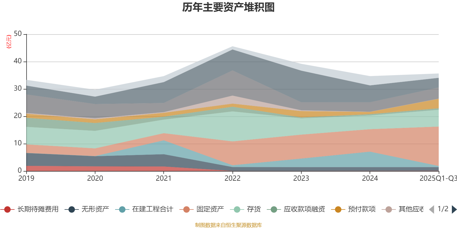 资产重大变化方面,截至2025年三季度末,公司固定资产较上年末增加75.08%,占公司总资产比重上升16.69个百分点;在建工程合计较上年末减少92.96%,占公司总资产比重下降15.14个百分点;货币资金较上年末减少43.1%,占公司总资产比重下降7.92个百分点;预付款项较上年末增加311.47%,占公司总资产比重上升7.28个百分点。
