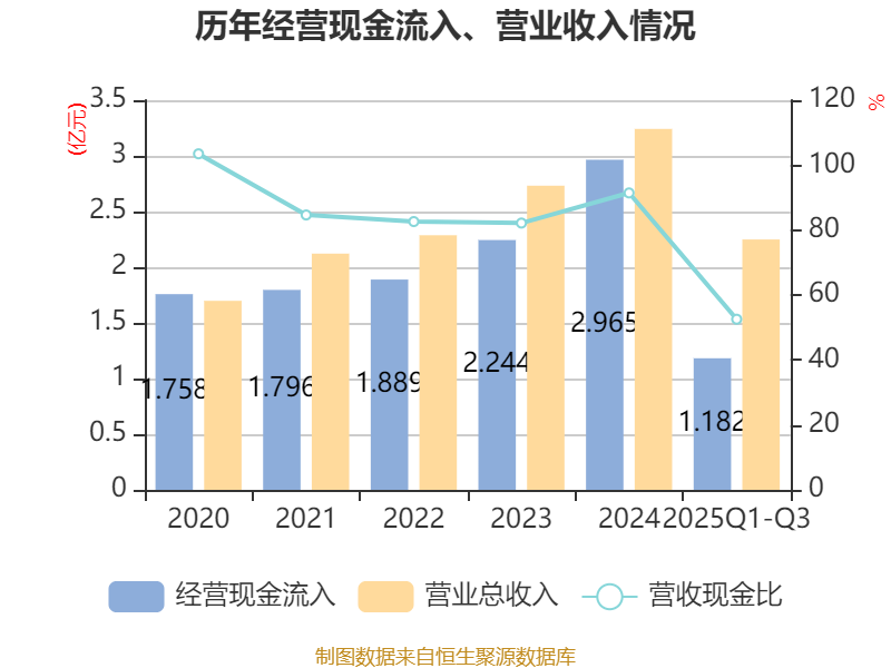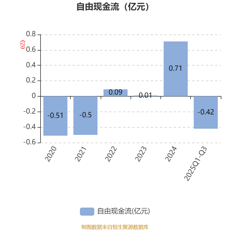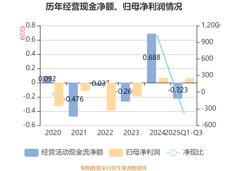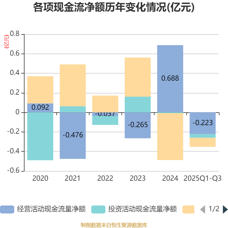 2025年前三季度,公司经营活动现金流净额为-2232.12万元,同比减少3844.28万元;筹资活动现金流净额-932.4万元,同比增加2522.67万元;投资活动现金流净额-374.02万元,上年同期为-76.51万元。