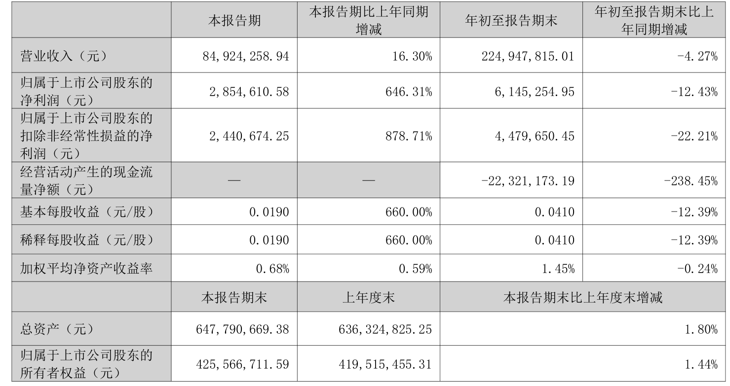 中证智能财讯申科股份(002633)10月31日披露2025年第三季度报告。前三季度公司实现营业总收入2.25亿元,同比下降4.27%;归母净利润614.53万元,同比下降12.43%;扣非净利润447.97万元,同比下降22.21%;经营活动产生的现金流量净额为-2232.12万元,上年同期为1612.16万元;报告期内,申科股份基本每股收益为0.041元,加权平均净资产收益率为1.45%。