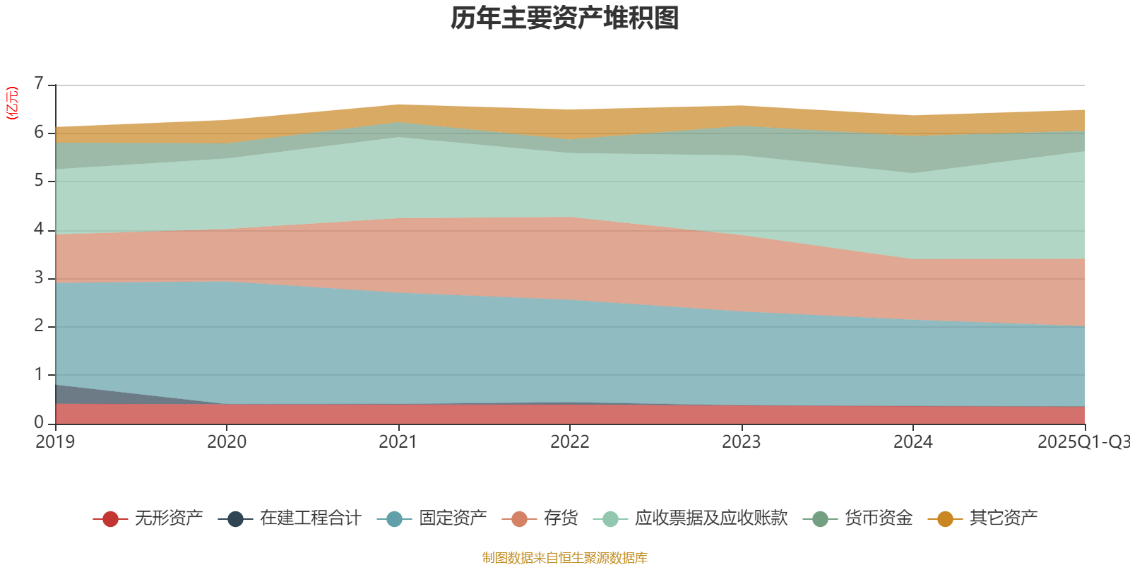 资产重大变化方面,截至2025年三季度末,公司应收票据及应收账款较上年末增加25.34%,占公司总资产比重上升6.44个百分点;货币资金较上年末减少45.26%,占公司总资产比重下降5.6个百分点;固定资产较上年末减少6.86%,占公司总资产比重下降2.38个百分点;存货较上年末增加10.94%,占公司总资产比重上升1.77个百分点。