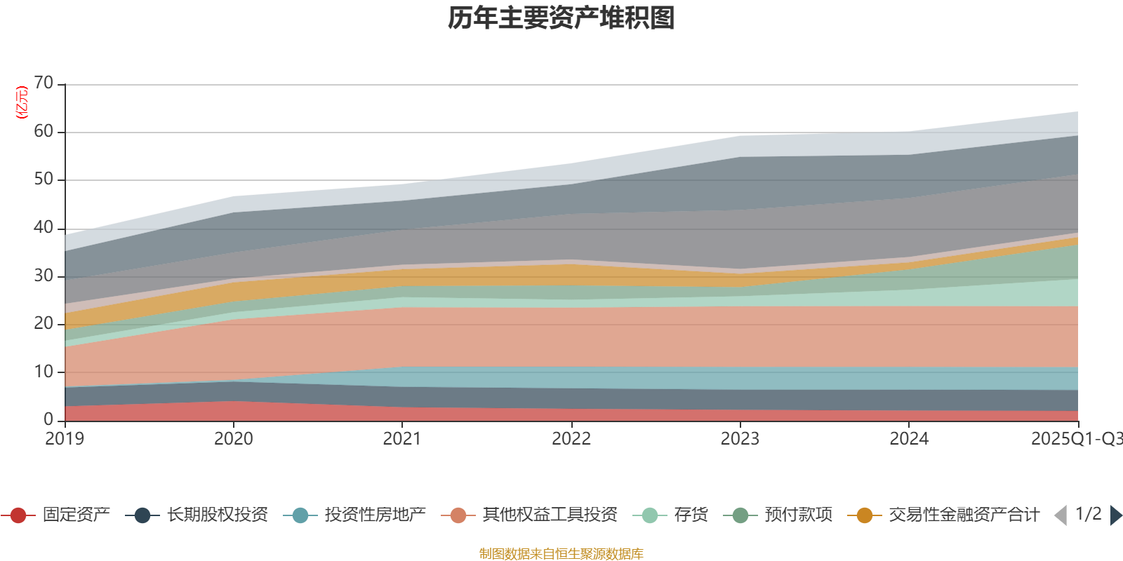 资产重大变化方面,截至2025年三季度末,公司预付款项较上年末增加69.39%,占公司总资产比重上升4.11个百分点;存货较上年末增加66.51%,占公司总资产比重上升3.15个百分点;货币资金较上年末减少10.26%,占公司总资产比重下降2.39个百分点;应收票据及应收账款较上年末减少0.93%,占公司总资产比重下降1.49个百分点。