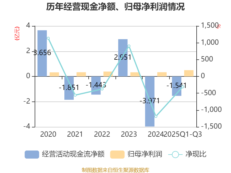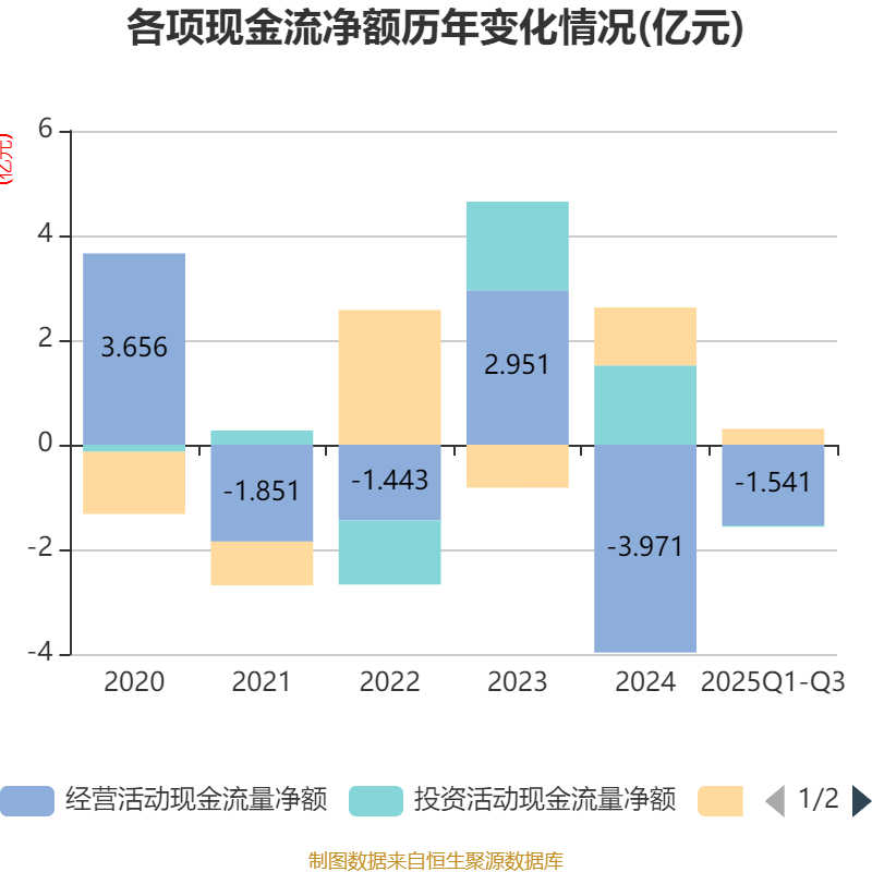 2025年前三季度,公司经营活动现金流净额为-1.54亿元,同比增加4.86亿元;筹资活动现金流净额3049.74万元,同比减少1.53亿元;投资活动现金流净额-257.89万元,上年同期为1.58亿元。