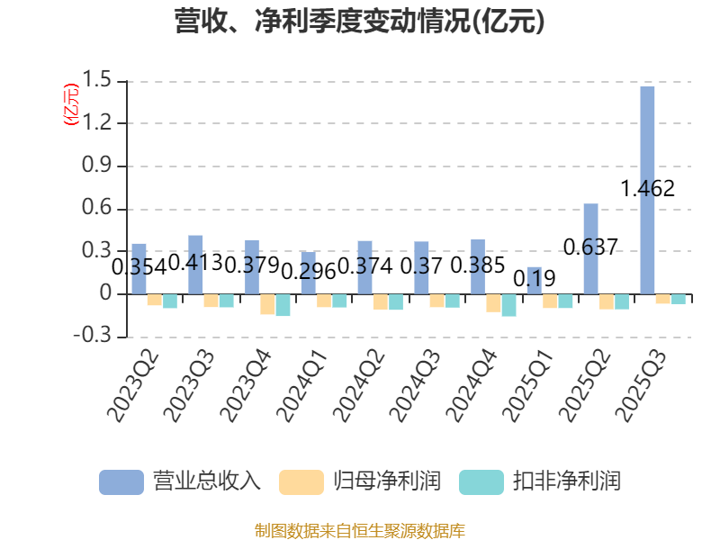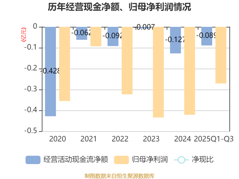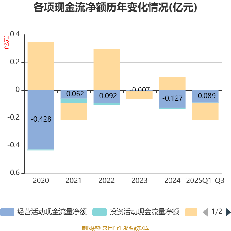 2025年前三季度,公司经营活动现金流净额为-885.98万元,同比增加552.97万元;筹资活动现金流净额-1234.04万元,同比减少2415.91万元;投资活动现金流净额-31.09万元,上年同期为-38.42万元。
