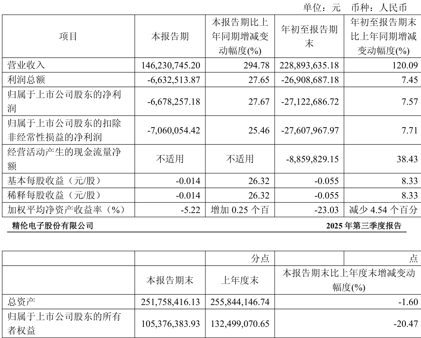 中证智能财讯 *ST精伦(600355)10月31日披露2025年第三季度报告。前三季度公司实现营业总收入2.29亿元,同比增长120.09%;归母净利润亏损2712.27万元,上年同期亏损2934.32万元;扣非净利润亏损2760.8万元,上年同期亏损2991.32万元;经营活动产生的现金流量净额为-885.98万元,上年同期为-1438.95万元;报告期内,*ST精伦基本每股收益为-0.055元,加权平均净资产收益率为-23.03%。
