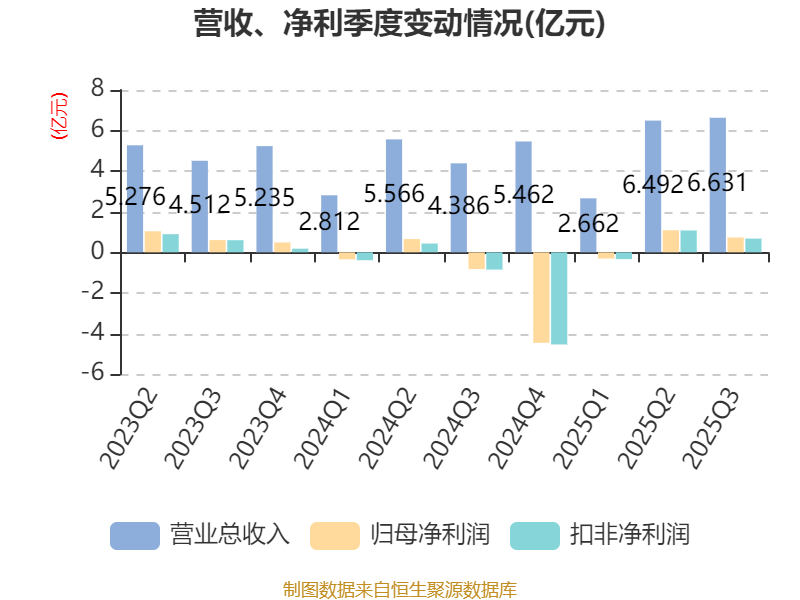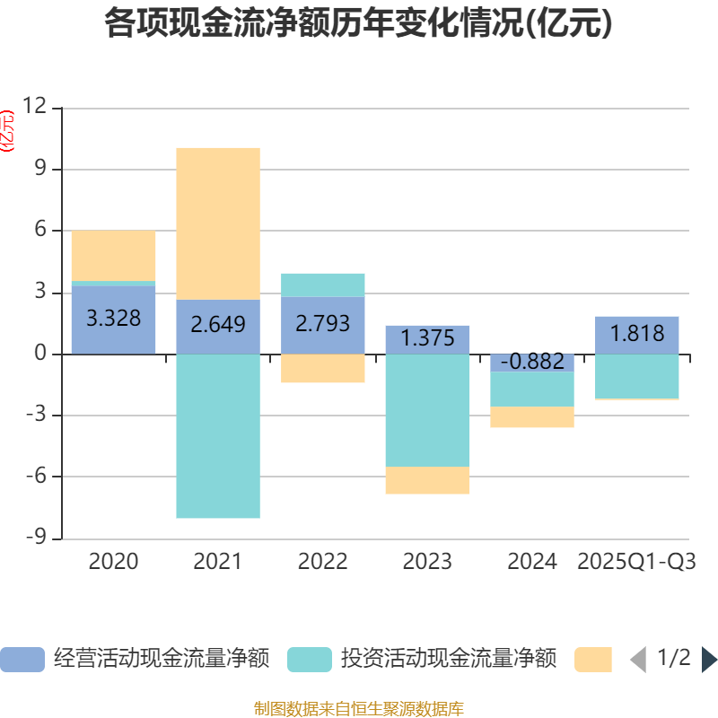 2025年前三季度,公司经营活动现金流净额为1.82亿元,同比增加4.23亿元;筹资活动现金流净额-622.71万元,同比减少2470.29万元;投资活动现金流净额-2.19亿元,上年同期为-1.8亿元。