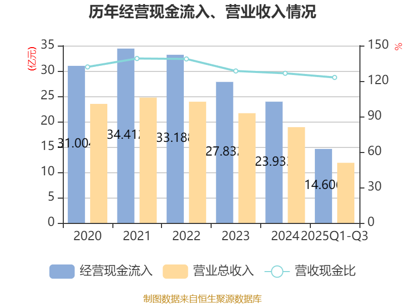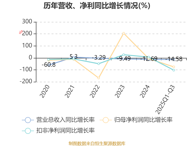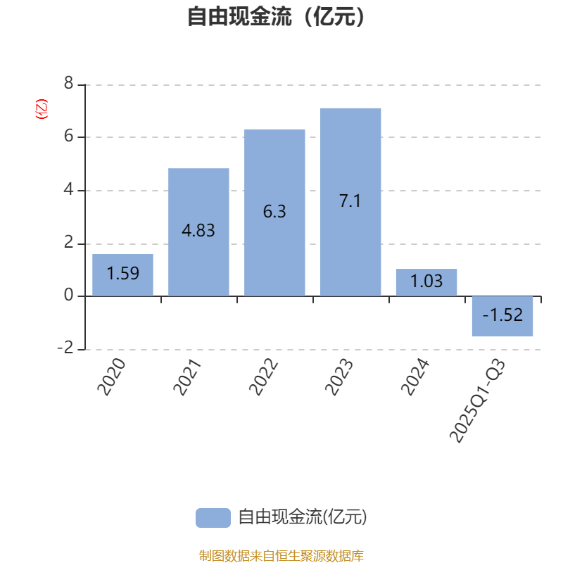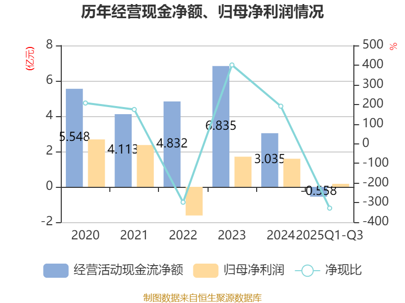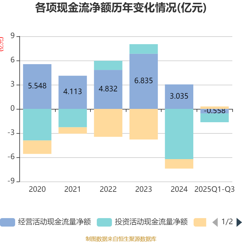 2025年前三季度,公司经营活动现金流净额为-5581.27万元,同比减少1.3亿元;筹资活动现金流净额3027.49万元,同比增加1.7亿元;投资活动现金流净额-1.09亿元,上年同期为-2.49亿元。