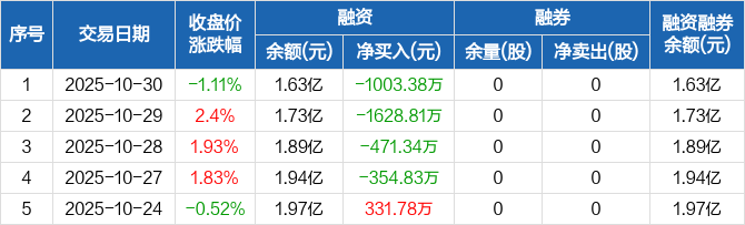 融资方面,当日融资买入1212.2万元,融资偿还2215.58万元,融资净偿还1003.38万元,连续4日净偿还累计3458.36万元。融券方面,融券卖出0股,融券偿还0股,融券余量0股,融券余额0元。融资融券余额合计1.63亿元。