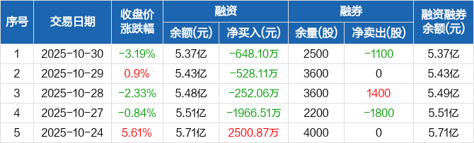 融资方面,当日融资买入3147.54万元,融资偿还3795.64万元,融资净偿还648.1万元,连续4日净偿还累计3394.79万元。融券方面,融券卖出0股,融券偿还1100股,融券余量2500股,融券余额16万元。融资融券余额合计5.37亿元。
