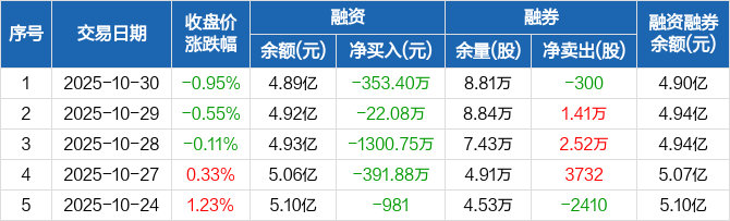融资方面,当日融资买入1260.03万元,融资偿还1613.43万元,融资净偿还353.4万元,连续5日净偿还累计2068.21万元。融券方面,融券卖出0股,融券偿还300股,融券余量8.81万股,融券余额156.95万元。融资融券余额合计4.9亿元。