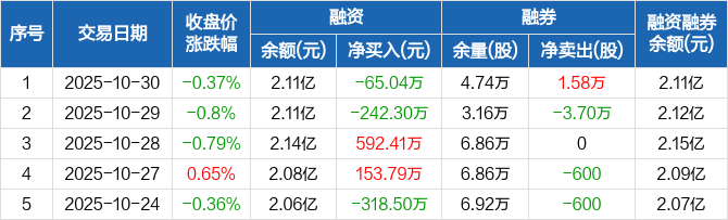 融资方面,当日融资买入743.74万元,融资偿还808.77万元,融资净偿还65.04万元。融券方面,融券卖出1.62万股,融券偿还400股,融券余量4.74万股,融券余额64.65万元。融资融券余额合计2.11亿元。