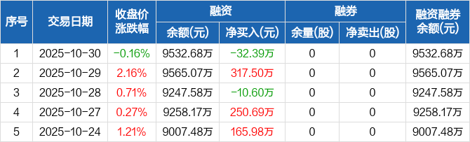 融资方面,当日融资买入1174.38万元,融资偿还1206.77万元,融资净偿还32.39万元。融券方面,融券卖出0股,融券偿还0股,融券余量0股,融券余额0元。融资融券余额合计9532.68万元。