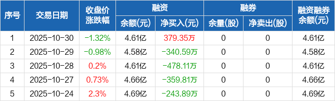融资方面,当日融资买入1489.66万元,融资偿还1110.31万元,融资净买入379.35万元。融券方面,融券卖出0股,融券偿还0股,融券余量0股,融券余额0元。融资融券余额合计4.61亿元。