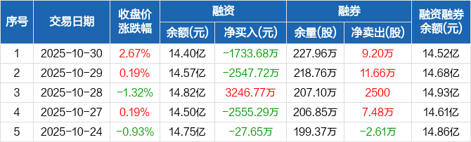 融资方面,当日融资买入1.09亿元,融资偿还1.26亿元,融资净偿还1733.68万元。融券方面,融券卖出9.66万股,融券偿还4600股,融券余量227.96万股,融券余额1228.7万元。融资融券余额合计14.52亿元。