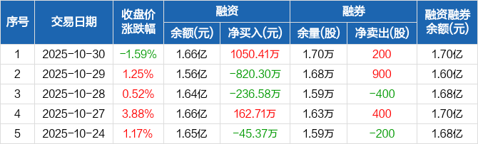 融资方面,当日融资买入2457.6万元,融资偿还1407.19万元,融资净买入1050.41万元。融券方面,融券卖出500股,融券偿还300股,融券余量1.7万股,融券余额429.78万元。融资融券余额合计1.7亿元。