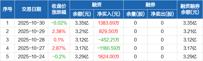 融资方面,当日融资买入2149.8万元,融资偿还766.11万元,融资净买入1383.69万元。融券方面,融券卖出0股,融券偿还0股,融券余量0股,融券余额0元。融资融券余额合计3.35亿元。