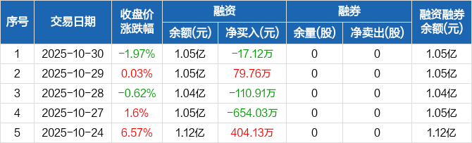 融资方面,当日融资买入1132.29万元,融资偿还1149.41万元,融资净偿还17.12万元。融券方面,融券卖出0股,融券偿还0股,融券余量0股,融券余额0元。融资融券余额合计1.05亿元。