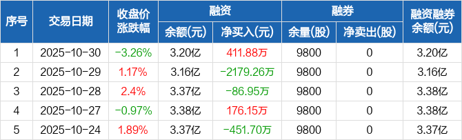 融资方面,当日融资买入3362.68万元,融资偿还2950.81万元,融资净买入411.88万元。融券方面,融券卖出0股,融券偿还0股,融券余量9800股,融券余额13.09万元。融资融券余额合计3.2亿元。