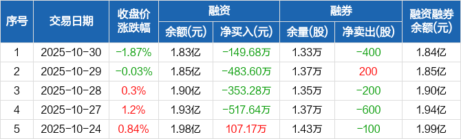 融资方面,当日融资买入1213.47万元,融资偿还1363.14万元,融资净偿还149.68万元,连续4日净偿还累计1504.2万元。融券方面,融券卖出0股,融券偿还400股,融券余量1.33万股,融券余额39.73万元。融资融券余额合计1.84亿元。