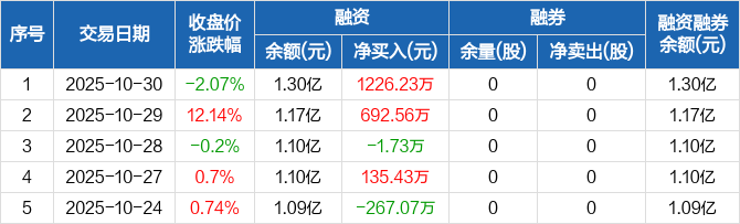 融资方面,当日融资买入2673.68万元,融资偿还1447.45万元,融资净买入1226.23万元。融券方面,融券卖出0股,融券偿还0股,融券余量0股,融券余额0元。融资融券余额合计1.3亿元。