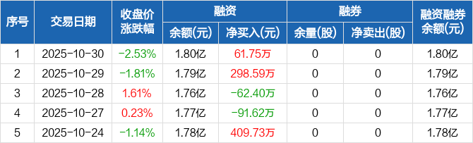 融资方面,当日融资买入998.09万元,融资偿还936.34万元,融资净买入61.75万元。融券方面,融券卖出0股,融券偿还0股,融券余量0股,融券余额0元。融资融券余额合计1.8亿元。