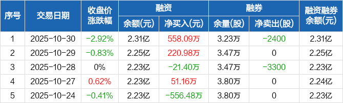 融资方面,当日融资买入1402.79万元,融资偿还844.7万元,融资净买入558.09万元。融券方面,融券卖出0股,融券偿还2400股,融券余量3.23万股,融券余额15.05万元。融资融券余额合计2.31亿元。