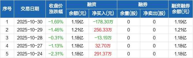 融资方面,当日融资买入346.75万元,融资偿还525.05万元,融资净偿还178.3万元。融券方面,融券卖出0股,融券偿还0股,融券余量0股,融券余额0元。融资融券余额合计1.19亿元。