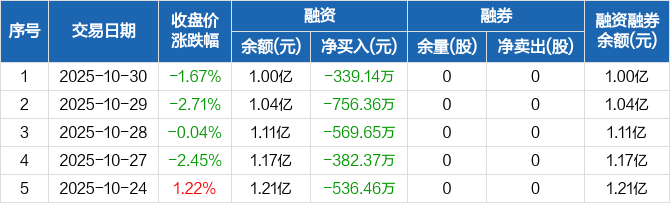 融资方面,当日融资买入916.79万元,融资偿还1255.93万元,融资净偿还339.14万元,连续5日净偿还累计2583.98万元。融券方面,融券卖出0股,融券偿还0股,融券余量0股,融券余额0元。融资融券余额合计1亿元。